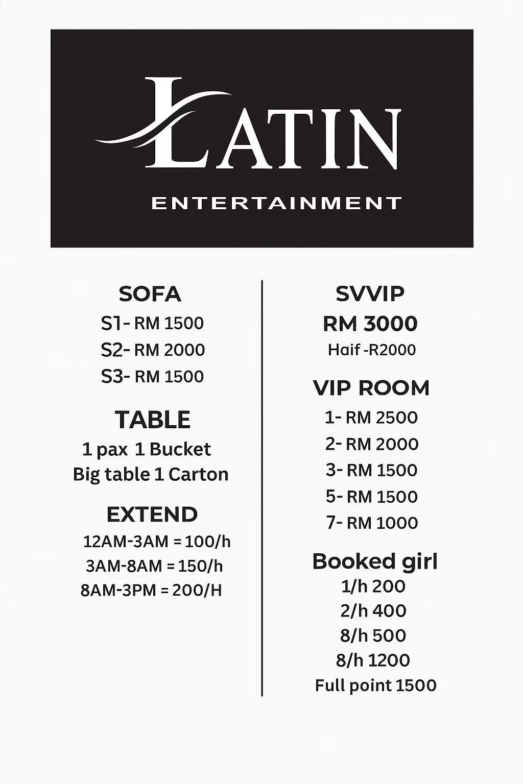 | Corkage | RM 300 - RM 500 |